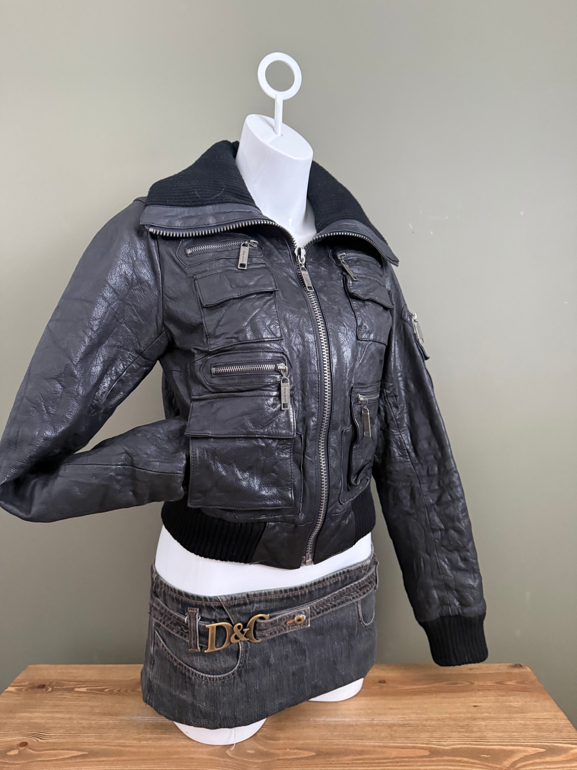 Leather Cargo Bomber Jacket (UK12)